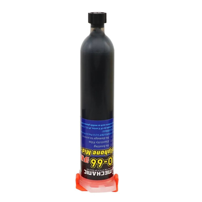 Mechanic KO-66 це спеціалізований клей-герметик у шприці обʼємом 30 мл, призначений для фіксації та ущільнення корпусної рамки мобільних пристроїв. Він допомагає щільно закріпити деталі, запобігає потраплянню пилу і вологи в зазори та полегшує точне дозування завдяки шприцу. Чорний колір зручно використовувати при видимих швах, де потрібно акуратно приховати місця склеювання. Шприц спрощує нанесення невеликих порцій без додаткових інструментів.